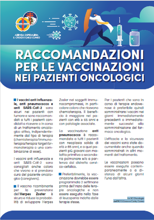 La SC Oncologia dell’AO S.Croce e Carle, Cuneo pubblica le raccomandazioni per le vaccinazioni nei pazienti oncologici