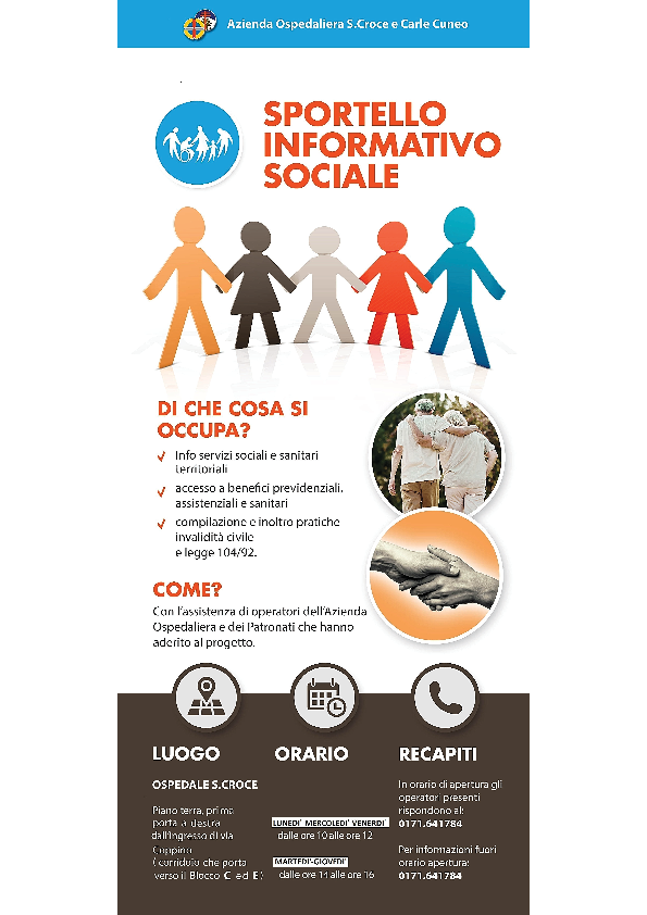 Giovedì 1 giugno 2017 è stato siglato il protocollo d'intesa tra l'Azienda Ospedaliera Santa Croce e Carle e dieci Patronati di Cuneo (50&Più Enasco, Acli, Enapa, Epaca, Epasa - Itaco, Inac, Inapa, Inas Cisl, Inca Cgil, Ital-Uil) per la gestione dello sportello informativo sociale che svolge la funzione di agevolare l'orientamento del paziente ricoverato e dei suoi familiari rispetto all'utilizzo dei servizi socio-sanitari presenti sul territorio.