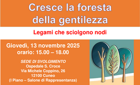 Il 13 novembre dalle 15.00 alle 18.00 il Gruppo aziendale del Linguaggio Ampio e Rispettoso presenta " Cresce la foresta della Gentilezza - Legami che sciolgono nodi" evento che prosegue il filo rosso tracciato dalle precedenti iniziative dedicate al personale aziendale per costruire insieme un modo di comunicare, confrontarci che tenga presente le differenze tra le persone e ne faccia una risorsa.