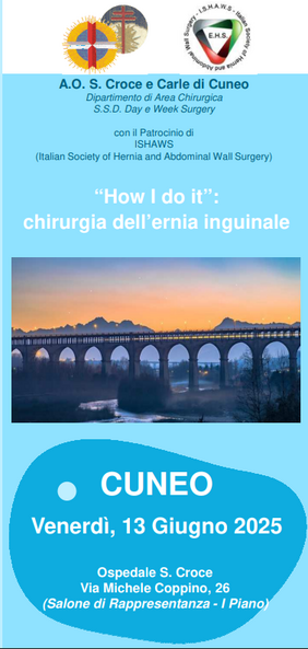 Venerdì 13 giugno si terrà a Cuneo, presso il salone di rappresentanza del Ospedale Santa Croce, il congresso dal titolo "How I do It - chirurgia dell'ernia inguinale" organizzato dal Dr Giorgio Giraudo responsabile della SSD Day e Week Surgery, che, dopo una apertura dei lavori del Direttore Generale, vedrà confrontarsi tra loro direttori di strutture omologhe e chirurghi da tutto il Piemonte.