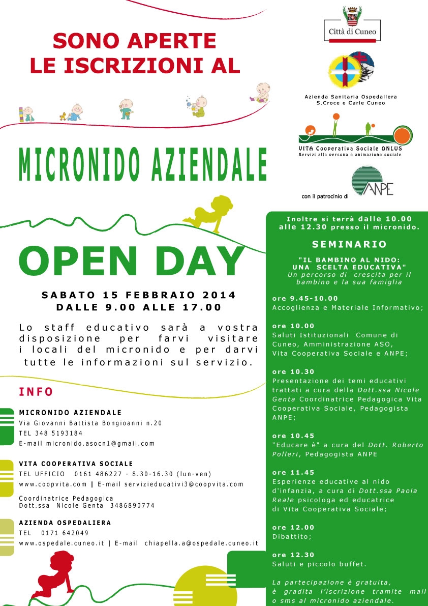Sempre il 15 febbraio, dalle ore 10 alle 12,30, presso la sede del micronido si terrà un Seminario dal titolo “Il bambino al nido: una scelta educativa” con i saluti delle autorità e interventi della dott.ssa Nicole Genta (Pedagogista Coop.VITA), del dott. Roberto Polleri (Pedagogista ANPE) e della dott.ssa Paola Reale (Psicologa ed Educatrice Coop. VITA).