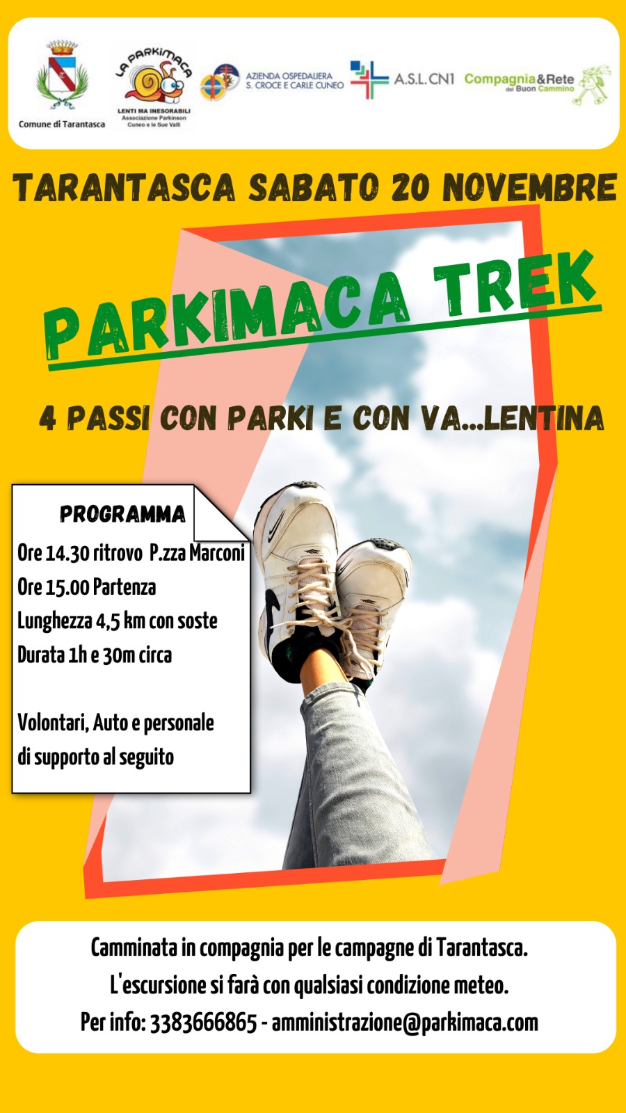 Sabato 20 Novembre 2021 si terrà a Tarantasca la 1° passeggiata non competitiva per promuovere le nuove attività dell’associazione “ PARKIMACA – ASSOCIAZIONE PARKINSON CUNEO E LE SUE VALLI “.