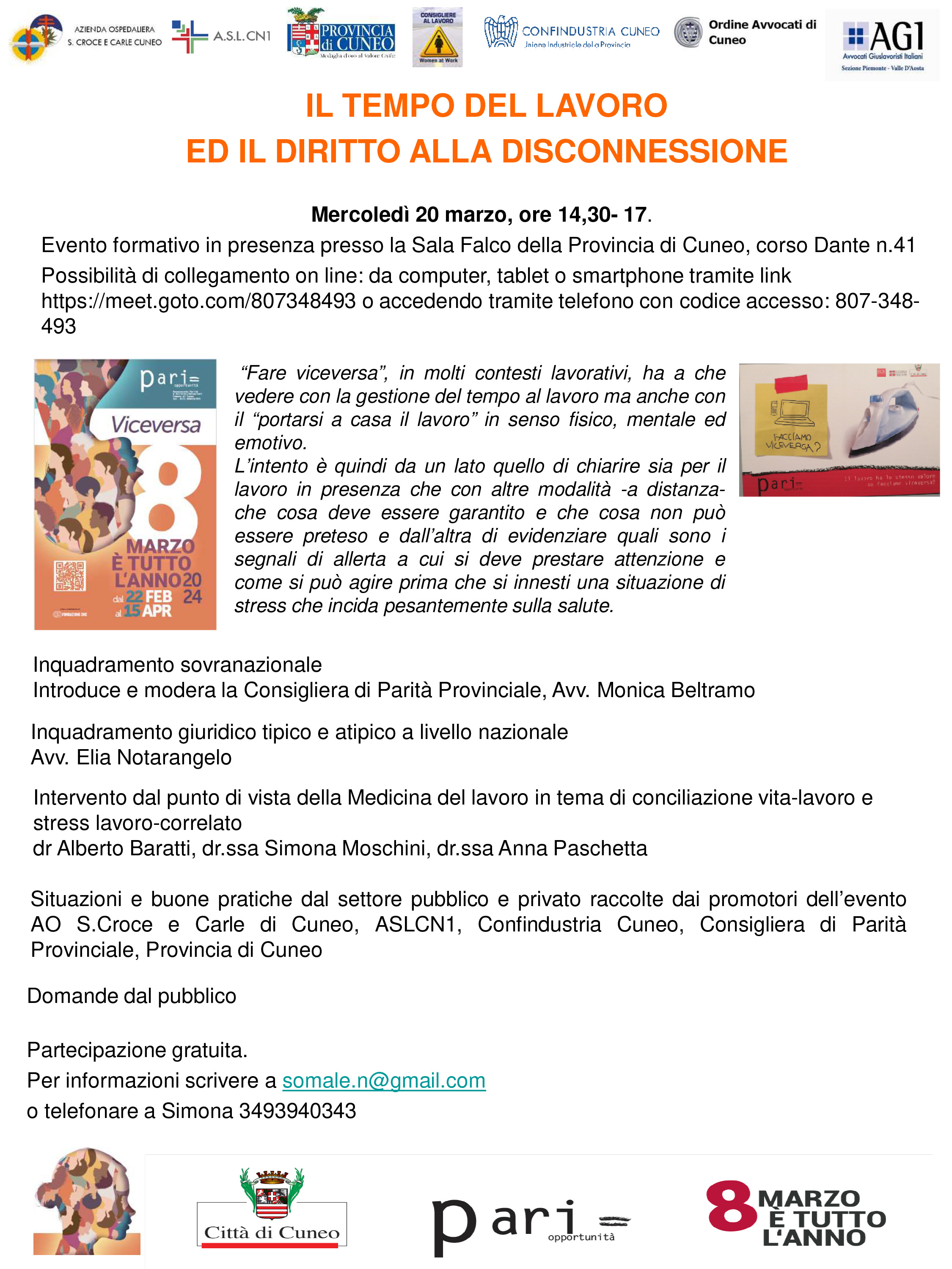 All’interno delle iniziative di 8 marzo è tutto l’anno - edizione 2024 vi invitiamo all’evento formativo “Il tempo del lavoro ed il diritto alla disconnessione” che si terrà il 20 marzo 2024, dalle ore 14,30 alle ore 17.