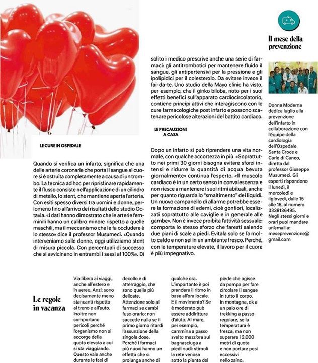 Esistono differenze di genere per l'infarto "sia per quanto riguarda l'impatto dei fattori di rischio sia rispetto ai sintomi con cui si manifesta". Lo dichiara in un'intervista, sull'ultimo numero del settimanale "Donna Moderna" il direttore della struttura di Cardiologia dell'azienda ospedaliera S. Croce e Carle Giuseppe Musumeci. Il presidente della società italiana di Cardiologia Interventistica sottolinea i sintomi e spiega cosa occorre fare quando si avvertono, come si interviene in ospedale per liberare l'arteria ostruita e quali sono le precauzioni che devono essere adottate alla dimissione soprattutto nei primi 30 giorni. Infine un vademecum per la vacanza: via libera ai viaggi, anche all'estero e in aereo, con qualche piccola precauzione.
