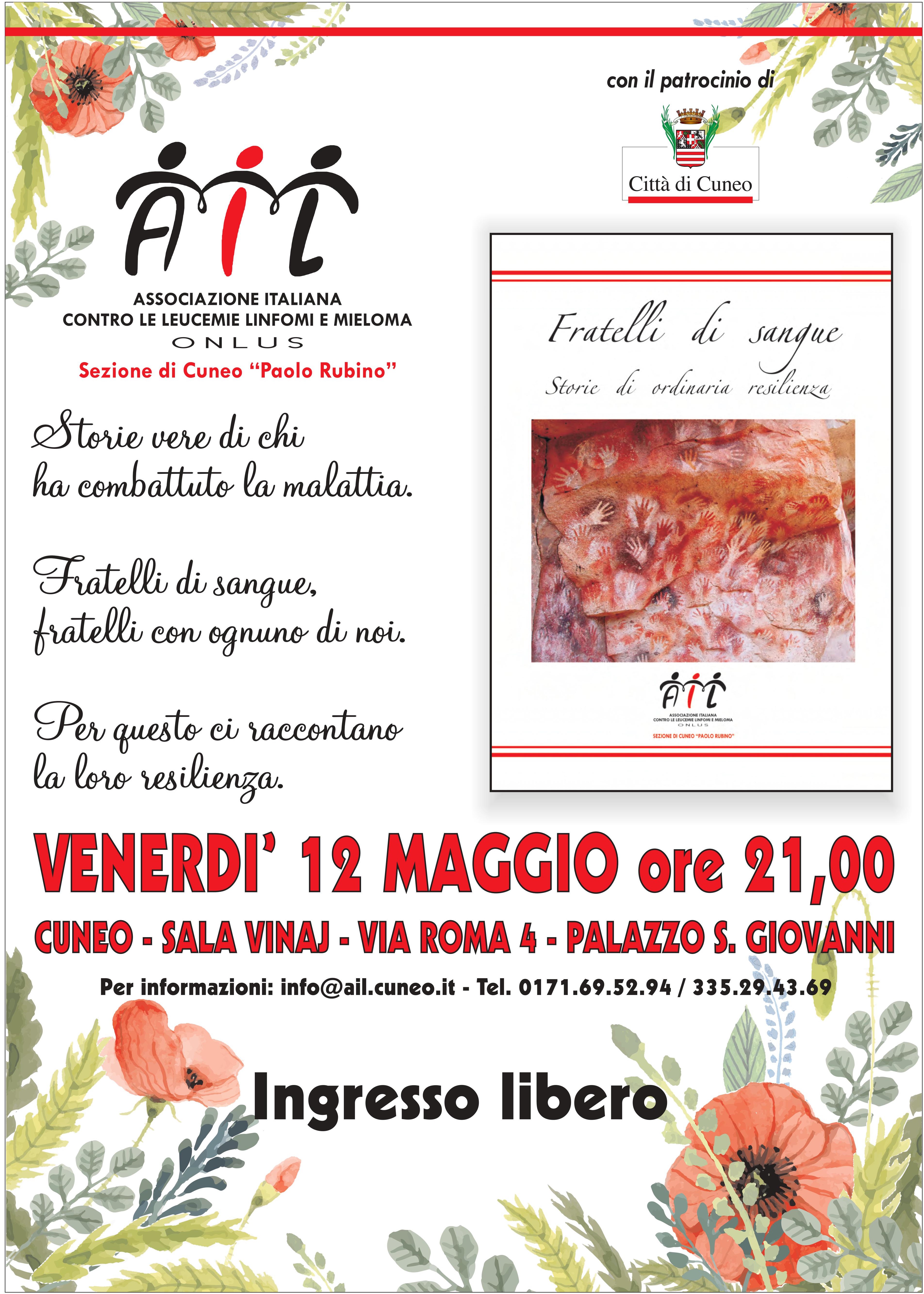 Leucemie, Linfomi, Mieloma: li chiamano anche tumori del sangue. Nominarli evoca inevitabilmente paura, difficoltà, timore di condanne senza appello. I protagonisti invece raccontano anche storie di speranza e vittoria, addirittura della capacità di trasformare il "nemico" in occasione di crescita personale. L'intuizione è venuta alla psicologa del reparto di Ematologia di Cuneo, d.ssa Maura Anfossi, che ha percepito in pazienti e familiari la voglia di dare uno sfogo alla propria esperienza e allo stesso tempo aiutare chi ancora la dovrà affrontare; un messaggio di incoraggiamento e di speranza forte e coinvolgente perché affidato a chi ci è già passato. Per chi "sta fuori", invece, un invito alla riflessione su cosa significhi affrontare una grave patologia oncologica: l'importanza delle relazioni umane, la fatica di riprendersi in mano la vita durante e dopo le terapie. Pubblicato a novembre 2016, il volume sarà presentato ufficialmente venerdì 12 maggio a Cuneo, in Sala Vinaj (ore 21 - ingresso gratuito). In una ventina di testimonianze si attraversa il percorso della malattia, della cura, del "prendersi cura" dai diversi punti di vista: si sono raccontati i malati, i famigliari e gli operatori sanitari, alcuni direttamente, altri in un'intervista. A raccogliere questo prezioso materiale è stata Claudia Patrone, volontaria A.I.L., ma - per uno strano gioco del destino - anche ex malata e famigliare di un paziente, oltre che giornalista per professione. Storie viere, dunque, di "fratelli di sangue": fratelli tra di loro e con chi ci è passato, con chi ancora ci passerà ma anche con ciascuno di noi. In nome di quel filo che ci tiene uniti sotto lo stesso cielo e ci vede sfidati - ciascuno a modo suo ma nella medesima condizione umana - in diverse prove di "ordinaria resilienza". La scelta del titolo è spiegata nella prefazione: "... ogni singola malattia coinvolge profondamente e lega, per sempre - diverse persone: il paziente innanzitutto, certo; ma anche i suoi familiari, gli amici; poi i medici, gli infermieri e gli operatori sanitari. Come dimostrano le storie qui raccontate, poco importa il ruolo che ciascuno si trova a vivere: davanti a un problema di salute, sono tutti fratelli. Fratelli di sangue, utilizzando la metafora che richiama questo genere di patologie. [...] I pazienti, i famigliari, gli operatori di cui parla questo libro sono pertanto presentati n ordine sparso, volutamente, a sottolineare la casualità del loro ruolo davanti alla malattia - tutti possiamo ammalarci, tutti possiamo trovarci ad assistere un congiunto - ma anche l'importanza paritaria che ciascuno riveste nel percorso clinico relativo". Le testimonianze sono intervallate da fotografie (© Bruno Murialdo e Stefania Spadoni - n.d.r.) che illustrano una frase scelta dai racconti.