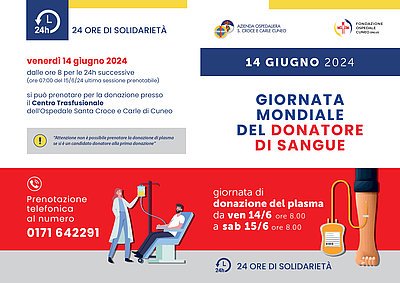 Cuneo, 28 maggio 2024. L’Azienda Ospedaliera S. Croce e Carle, attraverso il Servizio Immunoematologia e Trasfusionale Interaziendale e con il contributo della Fondazione Ospedale Cuneo organizza, con lo slogan “24 ore di Solidarietà”, in occasione della Giornata Mondiale del Donatore di Sangue in programma il prossimo 14 giugno, una raccolta straordinaria di plasma con apertura 24 ore consecutive del Centro Trasfusionale per le donazioni di plasma in aferesi.
