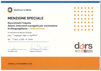 il video sul Linguaggio ampio e rispettoso presentato dall’Azienda Ospedaliera S. Croce e Carle di Cuneo ha ricevuto una menzione speciale durante la cerimonia di premiazione del primo Contest “Raccontami l’equità. Azioni, interventi e progetti per contrastare le disuguaglianze” in memoria di Marina Penasso, promosso dal Dors, Centro regionale di documentazione per la promozione della salute, in accordo con il settore regionale che si occupa del Piano di Prevenzione. L’iniziativa era rivolta alle ASL, ASO, Associazioni pubbliche e private no profit, Enti del terzo settore, Scuole di ogni ordine e grado del territorio piemontese ed invitava a raccontare le azioni e gli interventi orientati all’equità e al contrasto alle disuguaglianze, realizzati sul territorio piemontese con l’obiettivo di condividere e valorizzare iniziative per promuovere la cultura di riduzione delle disuguaglianze sociali e di salute, fungendo da esempio e sollecitazione per altre realtà e contesti. I video sono stati esaminati da una Commissione composta da professionisti aderenti ad ambiti multidisciplinari: esperti in comunicazione, di equità e di promozione della salute. Sono stati premiati i 3 ritenuti più rappresentativi rispetto a coerenza con il tema, chiarezza e capacità di veicolare le azioni e gli interventi di contrasto alle disuguaglianze e di promozione dell’equità. La Commissione, inoltre, ha ritenuto opportuno, a suo giudizio e parere insindacabile, assegnare una menzione speciale proprio al video sul Linguaggio ampio e rispettoso realizzato dall’Azienda ospedaliera, in quanto considerato un percorso interessante e innovativo, a “costo zero e a guadagno potenzialmente infinito”. Il video realizzato artigianalmente dal gruppo aziendale è liberamente visibile sul portale istituzionale www.ospedale.cuneo.it in Amministrazione trasparente/organizzazione/articolazione degli uffici/CUG. Tutti i video presentati al contest saranno consultabili sul sito www.dors.it e quelli premiati anche presso www.disuguaglianzedisalute.it e la banca dati CARE.