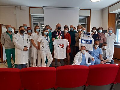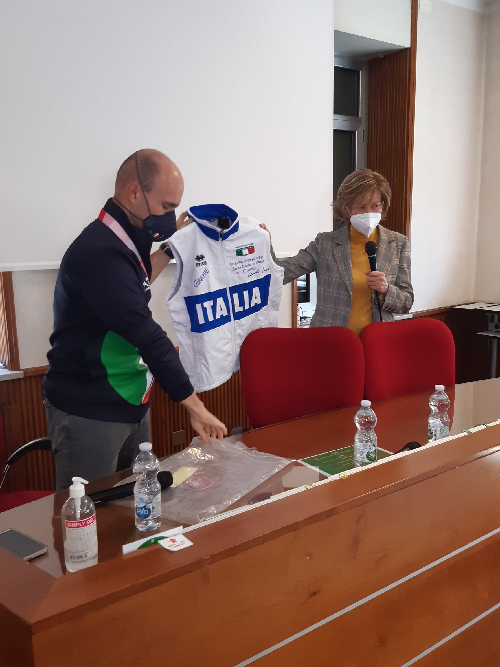 Diego Colombari ha donato all’Azienda una felpa dell’Italia con dedica all’ospedale, mentre dal S. Croce ha ricevuto la maglietta prodotta nel 2019, in occasione dei 700 anni dell’ospedale, un libro sulla Confraternita dell’ospedale e il testo, curato dal dottor Cartia, relativo agli ultimi decenni di storia del nosocomio.
