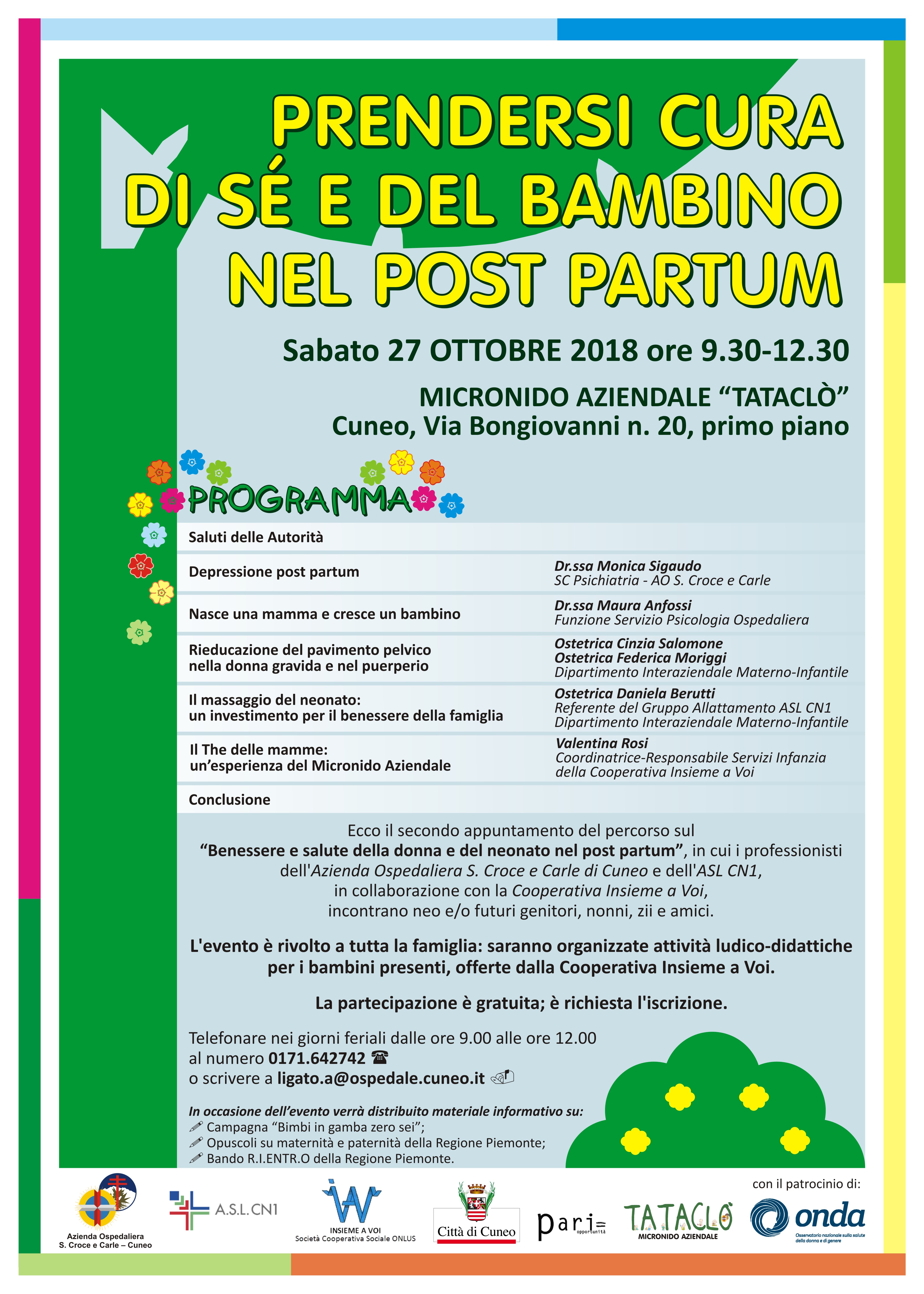 "Prendersi cura di sé e del bambino nel post-partum" è il secondo incontro del percorso sul benessere e sulla salute della donna e del neonato. L'appuntamento è per sabato 27 ottobre 2018, dalle 9.30 alle 12.30 al micronido aziendale TATACLÒ di via Bongiovanni, 20, al 1° piano della ex Caserma Piglione, a Cuneo.