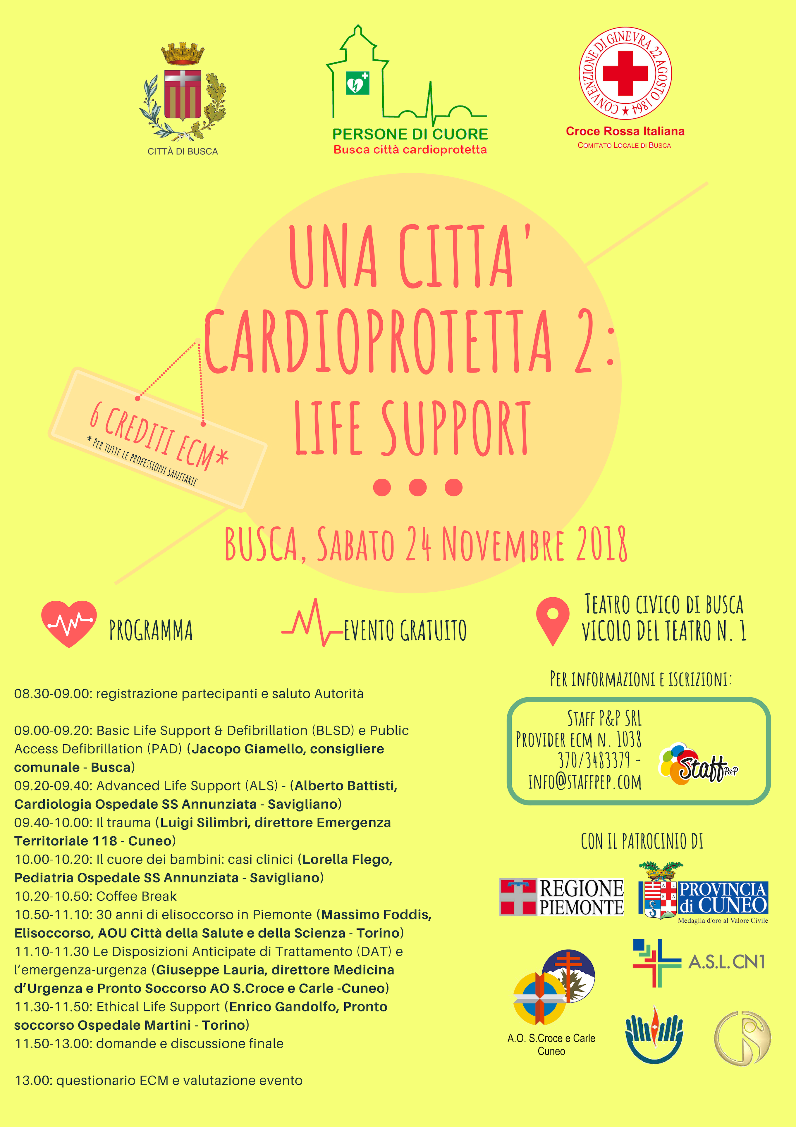 "Persone di cuore. Busca città cardioprotetta" è un progetto in continuo progresso. Voluto dal Comune insieme con la Cri di Busca e avviato nel 2016, esso si rinnova ogni volta che si svolgono i corsi rivolti a tutta la popolazione per far apprendere le principali manovre salva-vita (BLS, basic life support) anche attraverso l'uso del defibrillatore automatico esterno. Fino ad oggi se ne sono tenuti 18 che hanno abilitato all'utilizzo del Dae 552 persone (un numero molto significativo rispetto alla popolazione) . Inoltre, dopo il convegno medico dello scorso anno, che, inaugurando il progetto, ne aveva riconosciuto la peculiarità in campo nazionale, Busca si propone come sede di incontri annuali di aggiornamento sul tema. Il prossimo meeting è in programma per sabato 24 novembre dalle ore 8,30 al Teatro Civico con il titolo "Una città cardioprotetta 2: life support" e si svolge con il patrocinio degli ordini professionali dei medici e degli infermieri, della Regione Piemonte, della Provincia di Cuneo, dell'Ospedale Santa Croce e Carle di Cuneo, dell'Asl CN1. Ciò che fa di Busca un esempio per l'Italia è l'aver realizzato una rete assai fitta di postazioni Dae (una ogni 900 abitanti), le quali sono di pubblico utilizzo, pronte all'uso per chiunque in qualunque momento (non come nella maggior parte degli altri casi chiuse in teca e in luoghi non aperti a tutti) e che contemporaneamente si svolgano corsi periodici, compresi i relativi aggiornamenti, perché il più gran numero di persone possibile sia preparato agli interventi di primissima emergenza.